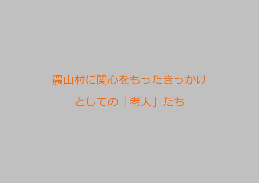 ■04 ○農山村に関心をもったきっかけとしての「老人」 先ほど申し上げたとおり、後藤先生の教室に所属するようになって、農山村の過疎集落などに出向くようになりました。まだ20歳を過ぎたばかりの頃ですが、そこで出会った人たちに、当時、衝撃を受けたんです。それはこんな、とても人間らしい老人たち。■05 ちょっと宗教家で、ちょっと医者、料理人でもあって、陶芸家、ダンサー、音楽家、エンターテイナー、大工もできるし、農作もできる。一つひとつは本業といえるような専門性はないけれど、こんな人たちが10人でも集まったら、どんなことができるだろうとワクワクしました。不思議とこれが、「格好いいな!」と思ったんですね。そういう人たちは、現在僕たちが住んでいる集落にもいるんですが、山や海から必要なものを取り出してきてしまう知恵であったり、省エネ技術ももう熟練というか、癖のようになってしまっていて、こうなりたいなぁと常々思っています。■06 共同作業に参加させてもらうこともたびたびあったのですが、要領も段取りもよく、作業中の雰囲気はなんだか祭りのようで、とても楽しい。こういう何でもない場面に、映画のワンシーンのような厚みを感じます。 また同時に、現代都会っ子という、■07 僕自身の現実を強烈に突きつけられたようで、後ろめたさもすごく感じました。僕たちにとっては、水道、電気、ガスといったライフラインというものは、文字通り集中治療室の生命維持装置のようなもので、どれかひとつでも断絶されたら、もうどうしようもなくなってしまう。先ほどの老人たちなら、例えば津波避難ということで山にこもっても、雨風しのぐ小屋のようなものをこしらえて、一日二日くらいなら、簡単にしのいでしまうのではないかと思います。