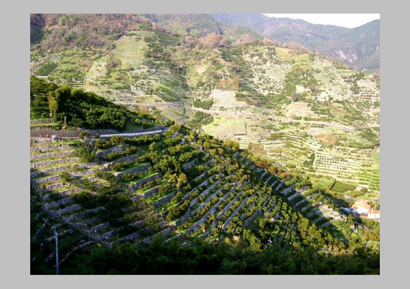 ■37 ○なんち屋のキーワード 最後に、僕たちのことをお話しします。ほのぼのとご覧ください。■38 僕たちの集落はこんな景観。石積みの段々畑が、集落の家屋群のすぐ背後から、そびえ立っています。これは時の権力者が命令して築いたものではなく、農民が自分の資産として投資していったもので、これが現役の農地、生きた景観です。この景色の中で、僕たちがどんな暮らしを送っているのかを、紹介していきます。■39 僕たちは、「なんち屋」という、地元地域の方言をもじった屋号を掲げています。この屋号は、主に農業生産やお客さんとの交流において名乗ることが多いのですが、お配りした僕たちのパンフレットにもあるように、キーワードとして次の5つを紹介しています。 ・農行(のうぎょう)となりわい ・「栽培」≠「農」 ・無肥料 ・地域づくりと家族 ・実践的研究 こういう風にキーワードをあげているんですが、僕たちとしては、それぞれのキーワードを分けて考えているというわけではなく、お互いに補完し合いながら、重ね合わせて考えているところがあるので、それぞれのキーワードごとではなく、暮らしの様子をざっくりまとめてお話していきたいと思います。