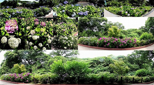 紫陽花はその他にアメリカ園〜花園橋バラ園横の通路に植えてありますが、花園橋は結構早くから綺麗に咲いてましたが通路のアジサイは最近は花が少なく、同じ位置に植えてある、カシワバアジサイは花が全然咲いてなかったですね。展望台の通路にもアジサイが色々植えてありますが、東側に大きな木があって午前中は日がささないですが、