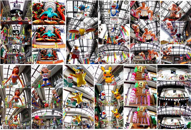 名古屋市西区那古野の円頓寺と円頓寺本町の両商店街で7月26日〜7月30日まで開かれる恒例の「円頓寺七夕まつり」、今年で62回で、商店街に入ると、時の話題などをテーマにユニークな作品たちが迎えてくれる。 ここは各商店が時の話題や張りぼて飾りが作られてアーケードにお目見えする。個性豊かで楽しげな作品が頭上からつり下げられ、道行く人たちを楽しませている。 今年は上野のパンダや稀勢の里などが話題に他には将棋やレゴなどもありましたが、名古屋城のおひざ元で、木造化が決まった名古屋城は話題になかったですね。これが庶民の声ですね。