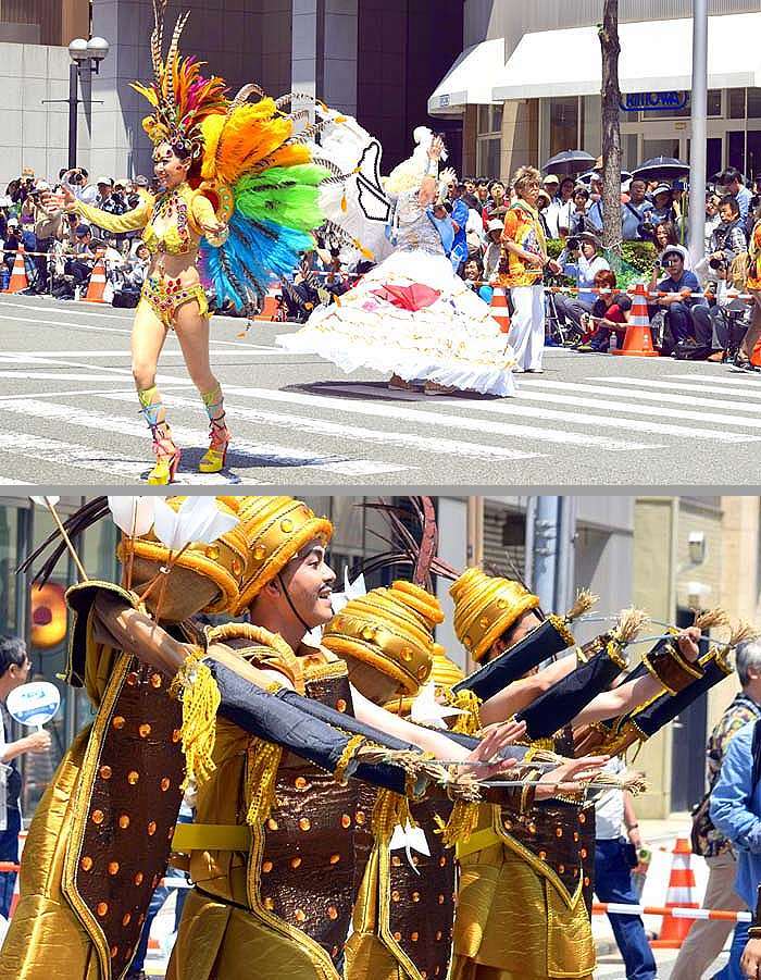 先日「第46回神戸まつり」は、神戸・三宮周辺でメインフェスティバルが繰り広げられました。 11時過ぎに神戸につきましたが、第一目標のサンバストリートは良い席を取るために、 すでに沢山の写真家が集まり、もう場所の悪い所しかありませんでした。 暑い中皆さん、12時からの開演を大きなカメラを持って待っていました。 港町神戸は何処も人人でしたが、特に (H)広場のサンバストリート周辺が一番混み合っていました。 12時からの各ダンサーの情熱的なダンスには、笑顔と迫力があり、時々歓声と拍手が起きました。 私達にも沢山サービス・ダンスをして頂きました。 汗ばむ陽気の中、軽快なサンバのリズムが響き、豪快なサンバの躍動に、私たちは感動しました。 多分リオのカーニバルにも負けない熱演を、間近で楽しムことができました。 各ダンサーはよく練習され、軽やかなリズムて、美しいダンスを披露してくれました。 この神戸祭りの経済効果は1日で100億円以上と言われています。