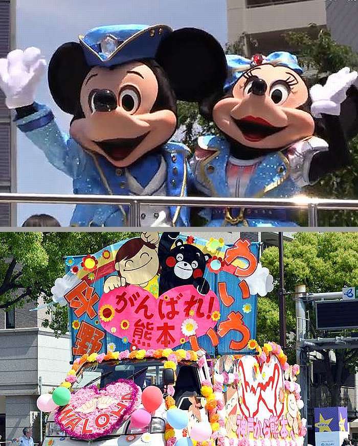 神戸まつりで、先ずは情熱的なサンバを堪能して、色々寄り道や、美味しい物を食べながら、 三宮のフラワーロードを彩る約5時間のパレードをユックリ堪能しました、 此処では色鮮やかな衣装のサンバチームやマーチングバンド、民謡など約6千人が続々に登場します。 沿道からは盛んに声援や拍手が送られた。「がまだせ!熊本」と熊本地震の被災地を応援する団体もありました。 まず最初は東京デズニーランドのキャラクター達が登場し、会場を盛り上げ、 続いて絶えることなく次々各団体(全部で75チーム)がパレードを繰り広げました。