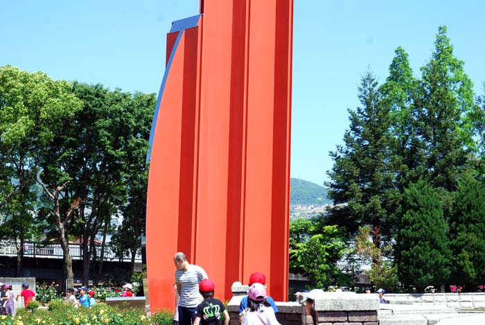 伊丹荒牧バラ園の中央にある赤い3本の柱は、華やかな薔薇によく合いますね♪v^ー゜)v 井上武吉氏作の平和モニュメントなんですね(ё_ё)