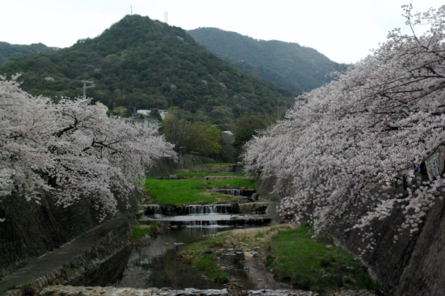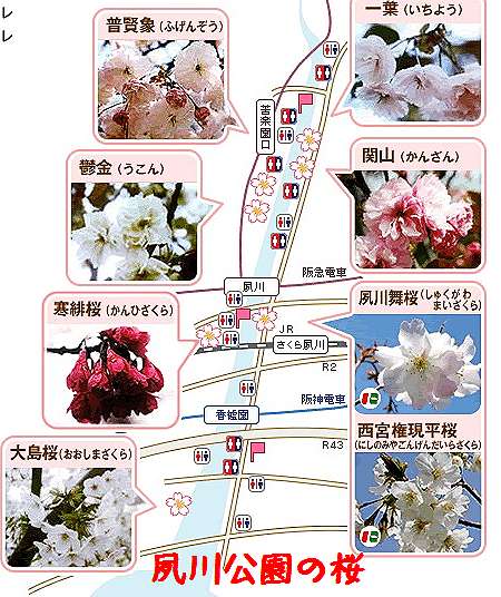 私達が桜見物した夙川公園は、 阪急電車の苦楽園口駅のすぐ東側に夙川の流れに沿って約3.2kmの長い帯状の夙川公園がつづいています。 苦楽園口がちょうど公園の北の端にあたり、ここから南へ約1660本の桜並木が、あでやかに咲き競っています。 夙川に沿っての桜や松並木の散策は最高です。 「日本さくら名所100選」にはふさわしい場所ですね。