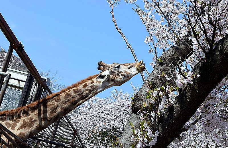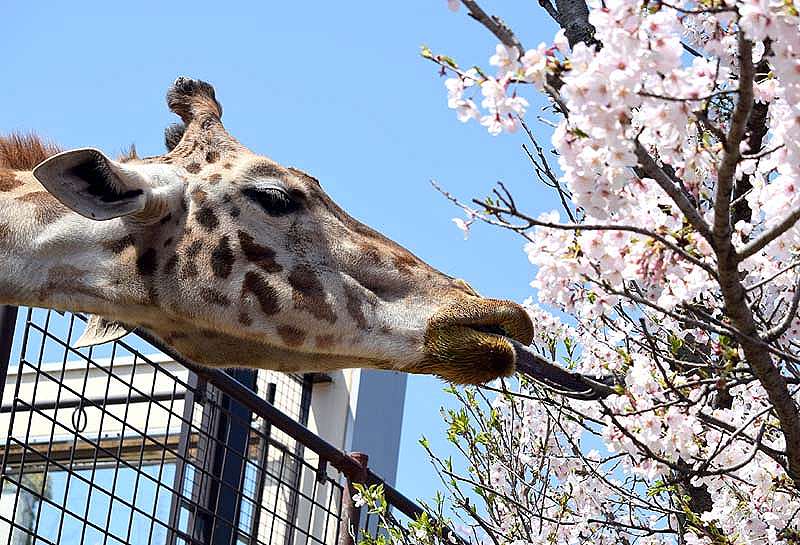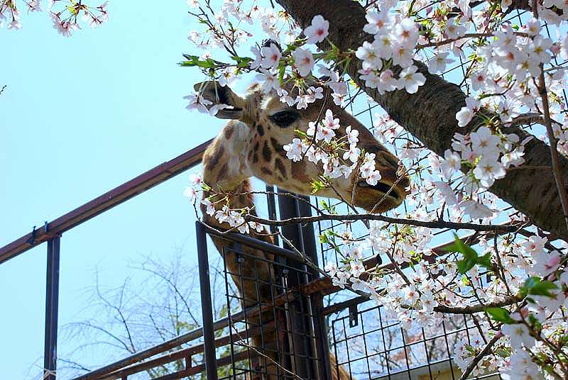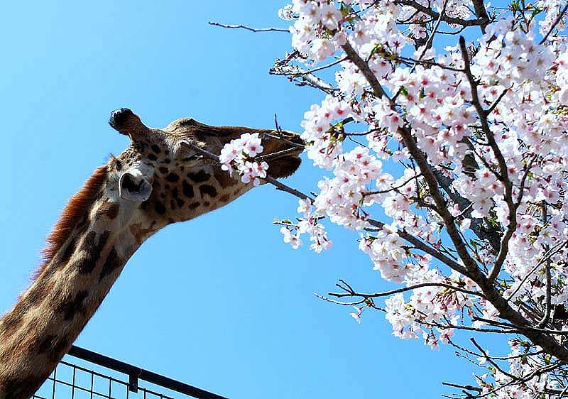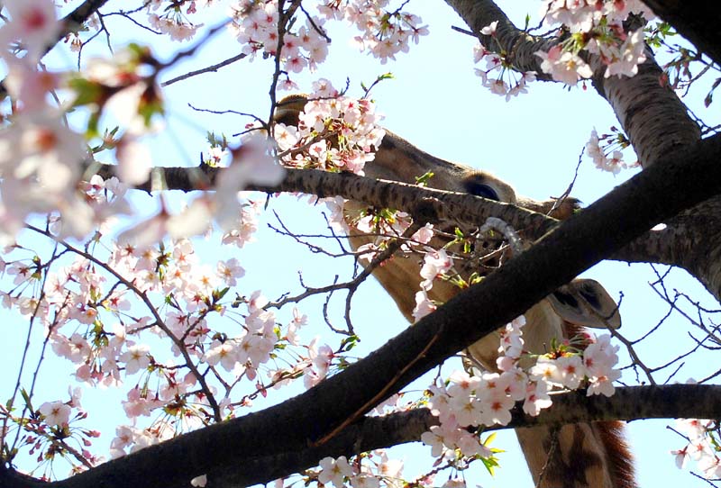 私たちはよく晴れた5日に神戸の王子動物園で 満開の桜を楽しんで来ました。 皆さんと一緒に動物たちとも楽しく触れ合ってきました。 満開の染井吉野の中から顔を出したキリンさん 美味しく満開の桜の花を食べ出しました。 これはビックリポンです