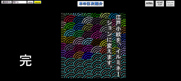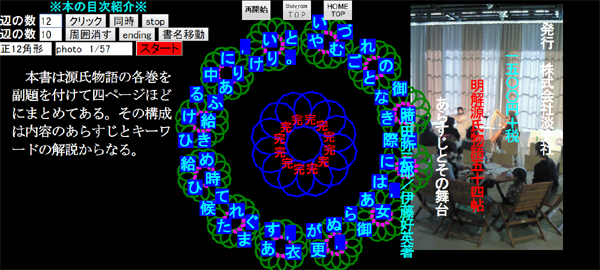 テーマ 源氏物語の目次紹介 0.ボタン追加 1.見出し9番を渦巻き状に並べる(再掲) epilogue()関数 2.時計盤の針を徐々に消す関数 erase_tikeiban()関数 3.完を12個並べる関数 the_end()関数 4.come_2 書名の読み込み 5.sutairu()関数,追加と変更 6.escoat()関数,追加と変更 7.メインスタートプログラム sin_6()関数 8.連動プログラム 書名移動 sin_6_2()関数 |