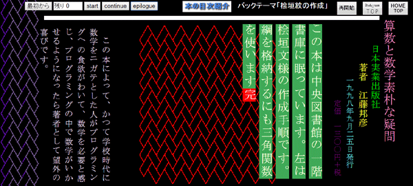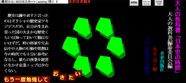 テーマ 大人の教科書「日本史の時間」紹介 1.エンディングの作成 epilogue()関数 epilogue_2()関数 2.書名の表示の色変更に伴う永久変更 4. come_2 縦書きのサブ関数 sutairu(nnn,x1,x2,x3,x4,x5)関数 3.このプログラムのみで使用する関数 book()関数 4.書名群の色をかえる関数 rand()関数 5.ランダムソートのアルゴリズムの学習 super_rand()関数 |