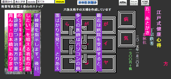 | 2018/6/01 | こころに響く方丈記 95_houjouki_design_5.html 完成 Google Chromeに対応 Google Chromeで閲覧して下さい |
