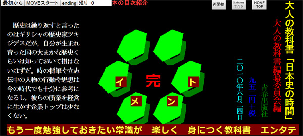 | 2018/11/25 | テーマ 大人の教科書 「日本史の時間」 99_nihonshi_design_12.html 完成 Google Chromeに対応 Google Chromeで閲覧して下さい |