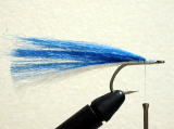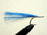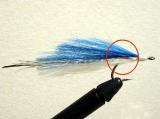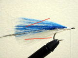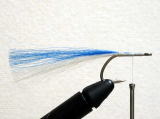 - 今回は、白の上に青のフィッシュヘアーをのせました。テール材を巻きとめる場合は、フックシャンクの真上に巻きとめ、シャンクに対してまっすぐになるようにします。左右どちらかに偏ると、水中でのバランスを崩す原因になります。