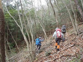 先頭の風花さん、今度は慎重に行きますが、、稜線は藪、、ちょっと下に踏まれた道を発見しました。