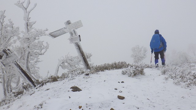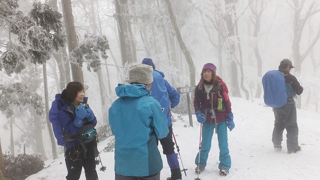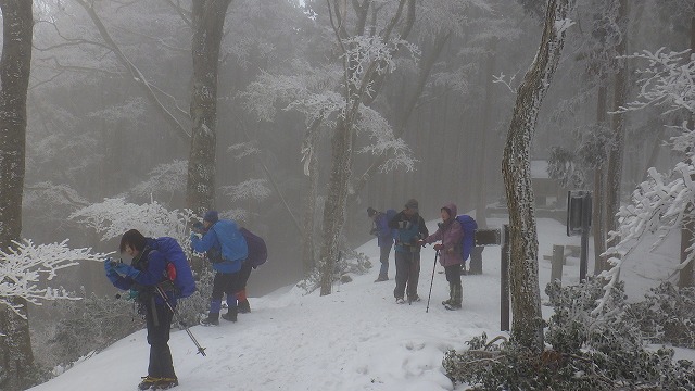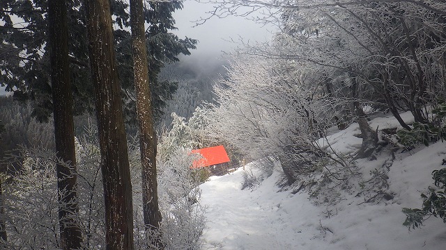 8:30 橋を渡る〜ジグザグに登山道を登る〜1合目(545m)〜2合目(640m)〜9:00 鉄塔〜9:20=9:30 アザミ小屋 アイゼン装着〜9:45 樹氷〜