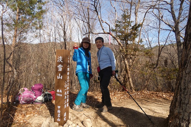 9:45 武田の杜入口〜10:00 小松原公園分岐〜10:20 中峠分岐〜10:30=10:35 金子峠分岐〜11:05=11:10 金子峠〜11:15 淡雪山の露岩〜