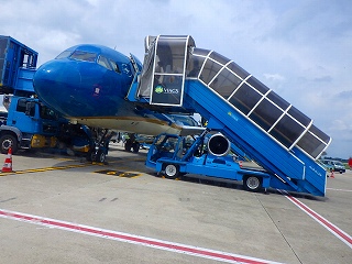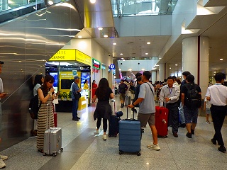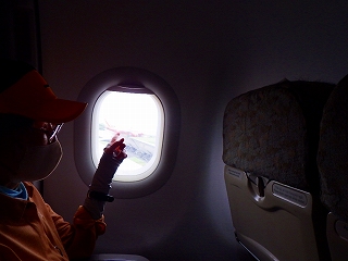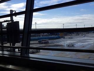 7:35 搭乗手続き開始、機内荷物預け〜機内手荷物検査〜8:00 ゲート入場〜8:05=8:35 お茶〜9:00 搭乗〜9:20 機内に