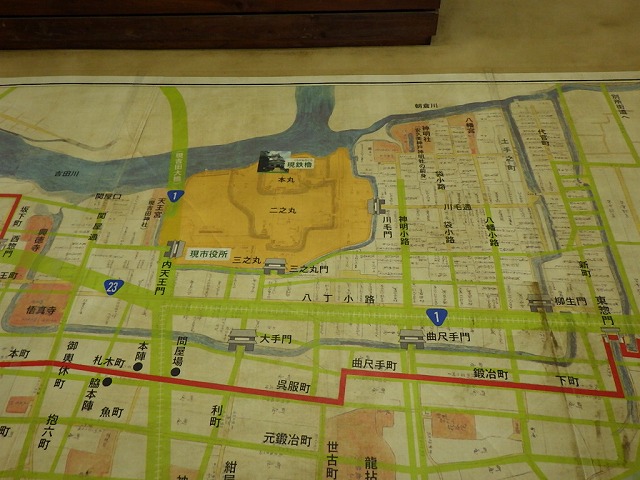 11:40=11:55 市電(豊橋~豊橋公園前)~12:00=12:20 豊橋市美術博物館見学~12:30=12:45 吉田城見学~12:50=13:10 豊橋市役所展望ロビー~