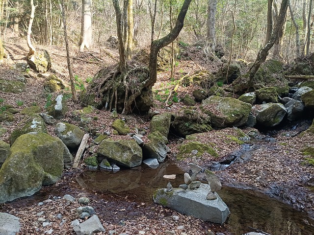 9:20=9:40 矢護山&鞍岳駐車場着、準備~9:40 矢護山出発~9:45 牧草地横~降り~渡渉~10:15=10:25 不動寺跡~10:25 渡渉~