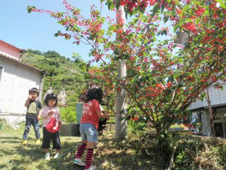 "What is that pink tree!?" Umeo shouted. As we went close, we came to know that the tree was full of beautiful cherries.