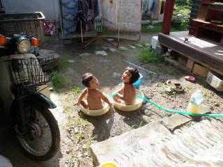 まあ、なんとかなる、ということでそのまま帰ってきて、ひとまず、かんまん部屋の改修のときに残っていた、使われないまま放っておかれていた古い釜に入れておくことにしました。これを、直接日光の当たらない、軒下の縁側に据えてみると、なんだかしっくりきているように思えてきて、しばらくこれで行こう、ということになります。(う)も(す)も物珍しいのに喜んで、ホースをつけっ放しにしていたので、そのまま横で水遊び。