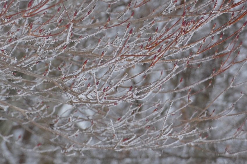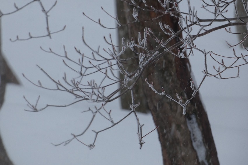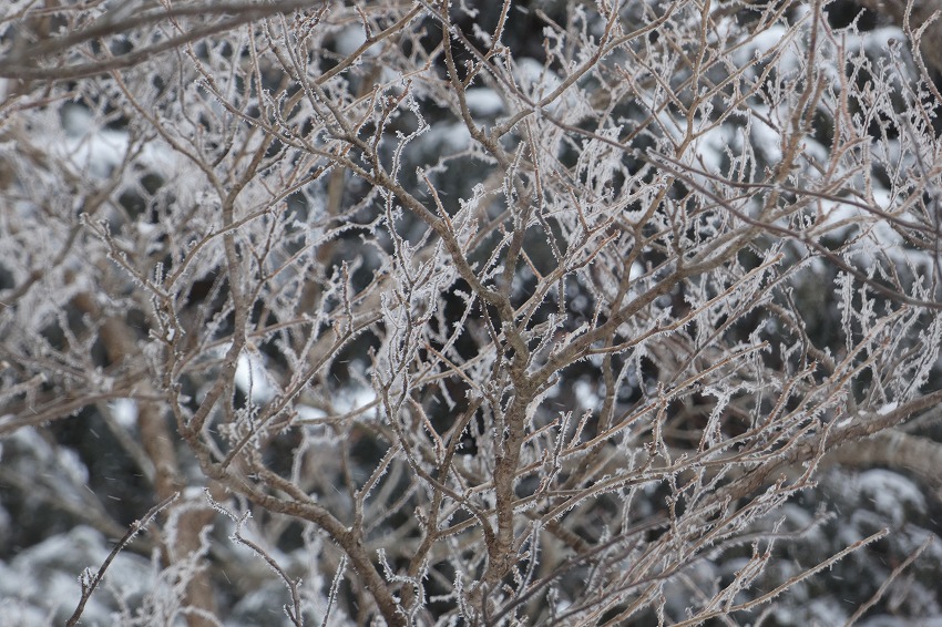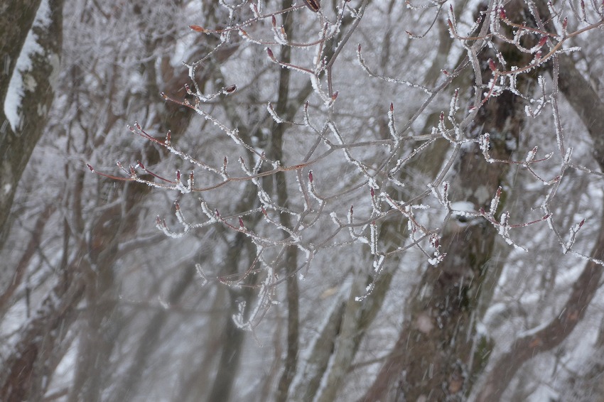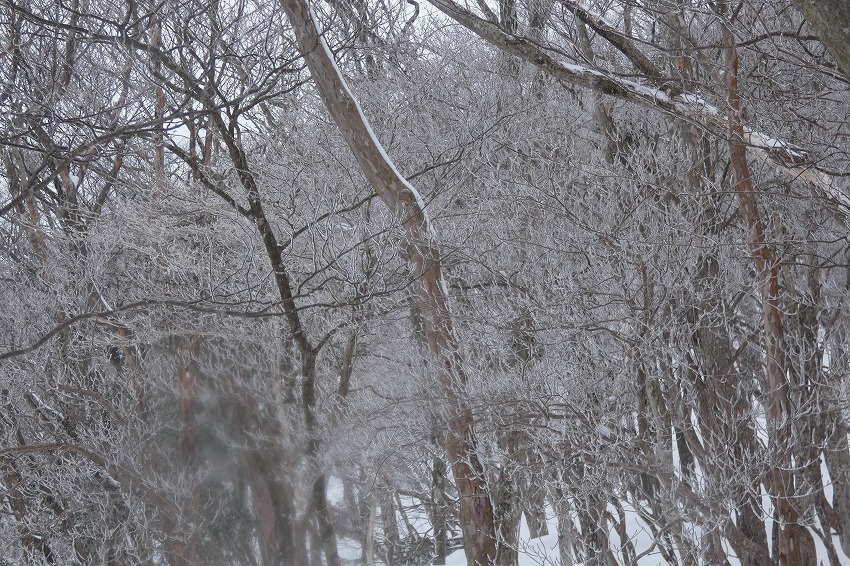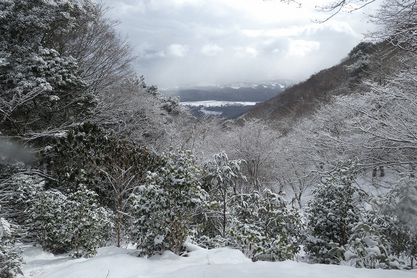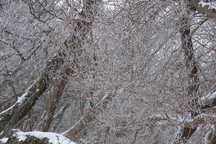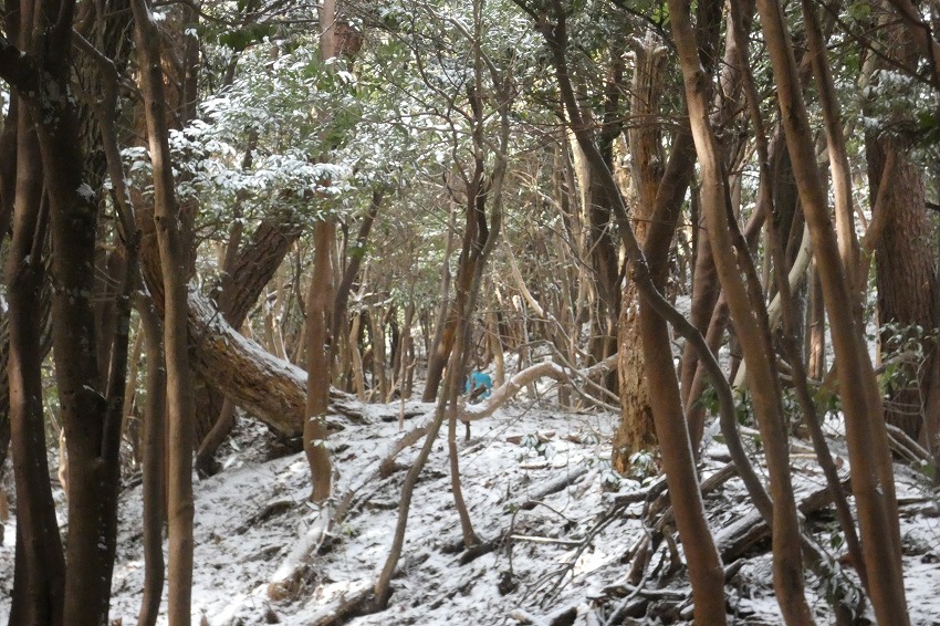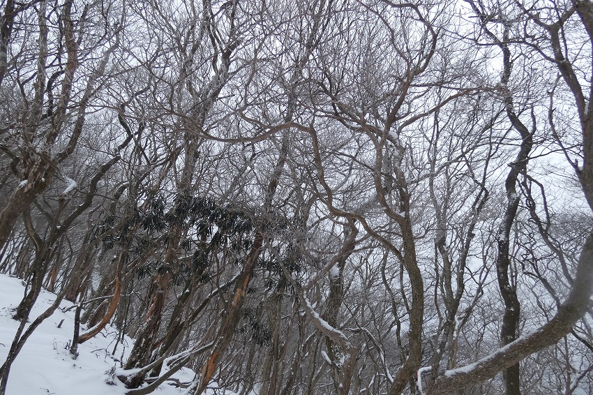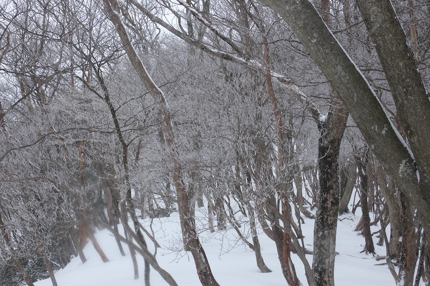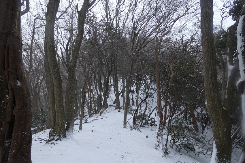 (ジオンさん記) 今日は近場で大垣市内の最高峰 烏帽子岳に登ります。 天気予報はあまりよくありません。 雪?が朝方降り出して、昼頃まで降る予報です 。 烏帽子岳はほぼ 樹林帯だし、 降雪量も大したことなさそうです。 駐車場に車は2台 。 私達も物好きですが、雪が降ってるのに、先行者もいるようです。 ゆっくりの支度をして、8時20分に 登山口 出発。 途中で 第1展望所 、第3展望所、 8合目分岐のところで休憩してから、時計回りに、大岩 コースから登ります 。 今日は 迷ったのですが、 夏靴にチェーンスパイクと わかん。 途中から雪が出てきましたが、先週 降った雪が溶けて凍って、その上に 今日の新雪がうっすらと積もってるので、 チェーンスパイクでは、歯が立たないかも ではと、久し振りのわかんで、登りましたが、 凍ったところは 、登りづらい感じでした。 今日は 前爪アイゼンが良かったかな ?。 先行の方たちは親子連れ 。 中学生ぐらいの男の子でしたが、頑張って 登りましたね。? もう1人の方もアイゼンで大岩コースでピストン。 途中ですれ違って、山頂へ 。 山頂は風はあまりきつくなかったのですが、展望もあまりないので、 和たんを待って、すぐに下山。 下山は展望台コースです 。トレースは無し。 雪が多そうなところを降ります。 雪がたっぷりというわけではないので、なかなか歩きづらいところもあります 。 展望台まで行くと、ちょうど登って来られた方と、すれ違いました。 今日は4組だけかな? そこから トラバースして、 8合目 分岐 まで。 8合目 分岐で和たんを待ってから、頑張ってわかんで、降ります。 そのまま 第1展望所まで行きましたが、 土が出てきて、わかんを脱いで降ります。 下山は12時過ぎ。早い 下山でした 。 |