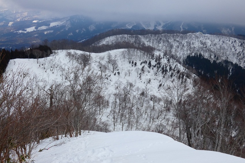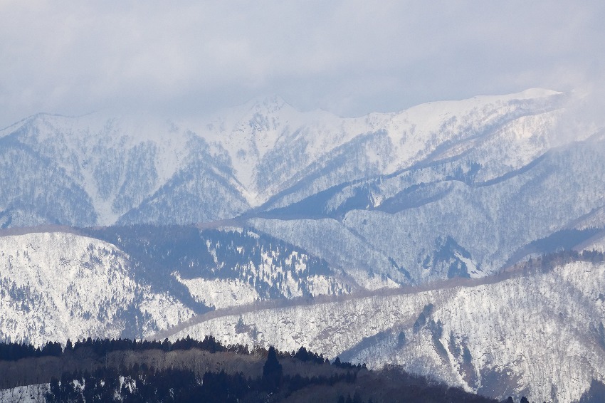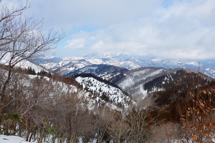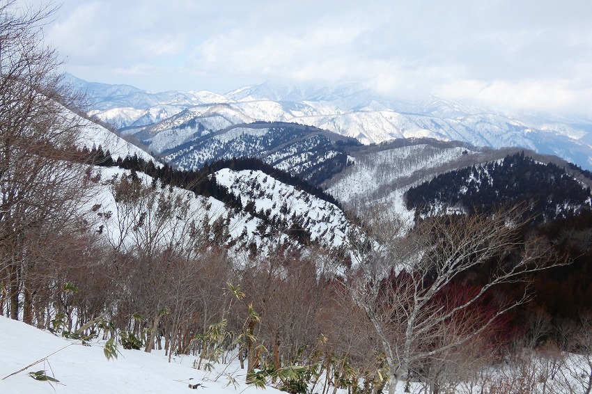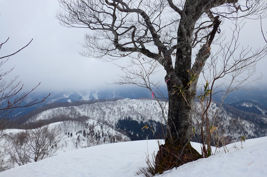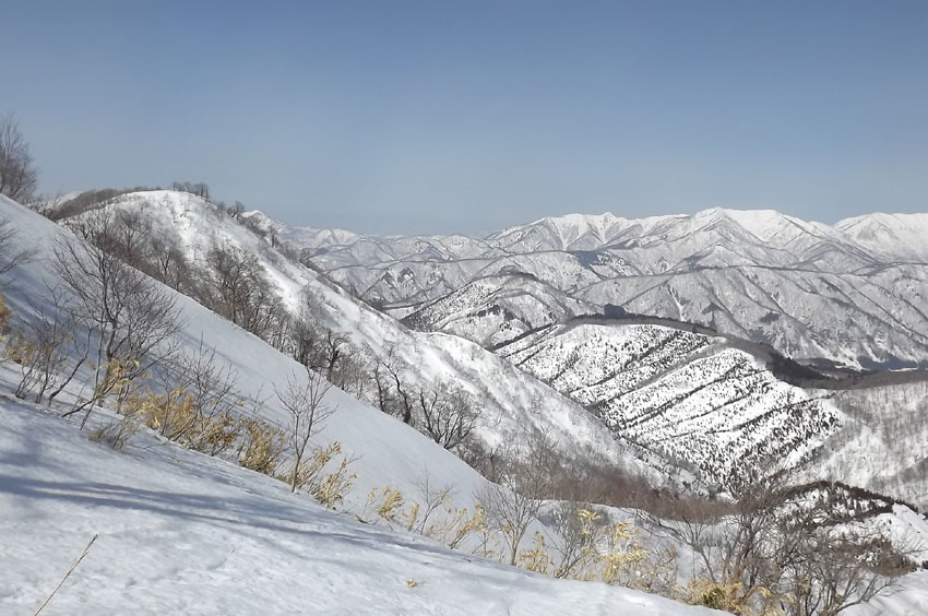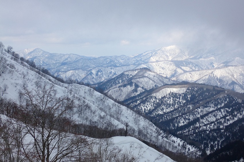 (ジオンさん記) 山を始めた19年前に、和たんと 毘沙門岳(2007.1.31)に行きましたが、 その日は ガスが出て 、山頂まで行きましたが、 全然展望なし。 途中で林道から、自衛隊の方がレスキューの訓練で来られて 、約10分ぐらい 登山道で待っていた記憶がありました。 最初はゲレンデの左手 から、すぐにスノーシューを履いて 登りますが 、 今日は暖かく 、そんなに雪も凍っていません。 ゲレンデの脇を、リフトの最終のところまで登ります。 ブナ林が綺麗です 。 そこから尾根に乗って、 毘沙門岳に。 今日は予報 あまり良くなく曇りで、昼から下り坂の予報です。 山頂近くはガスってますが、歩いた登山道も、展望も少し見られて嬉しいです。 行けるところまで行って帰っくる予定です。 途中 福井方面が少し晴れてきました 。 もう少し頑張って山頂まで行こうかと 、山頂 直下まで来ましたが、 結局 山頂の方がまたガスってきて、無理せずに 戻ります。 ゲレンデ トップから上の登りは、結構 アップダウンがあって、今日はわかんの方が良かったかなと、思いました。 ゲレンデまで戻って、ここからの降りは、日本一長い 1.5kmの ソリすべりができる ゲレンデ。 子供達の歓声が聞こえます。今度はそりを持ってきて、 ゲレンデを滑りたいです。 ゲレンデの横をずーっと歩きましたが 、これが緩やかな下り坂で、 トレースなしで、ゲレンデから上はわかんが良かったのですが 、 この降りは、なだらかで気持ちが良く 、スノーシューで気持ちよく歩けて良かったです 。✌ 前日は快晴。晴れたら、こんな景色が