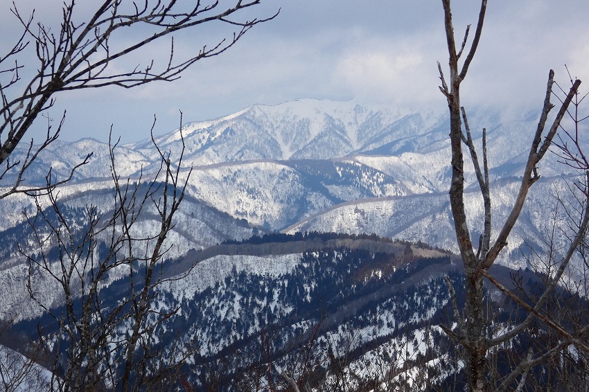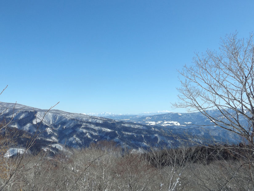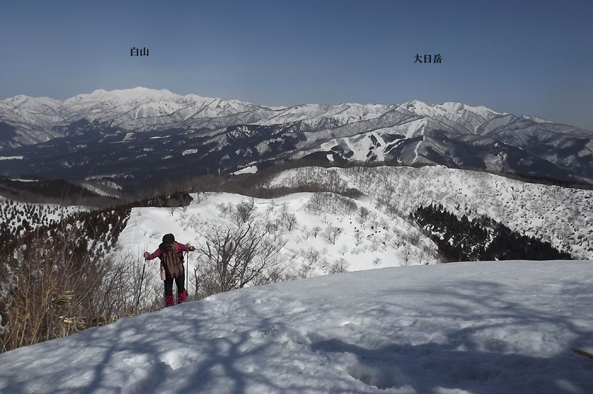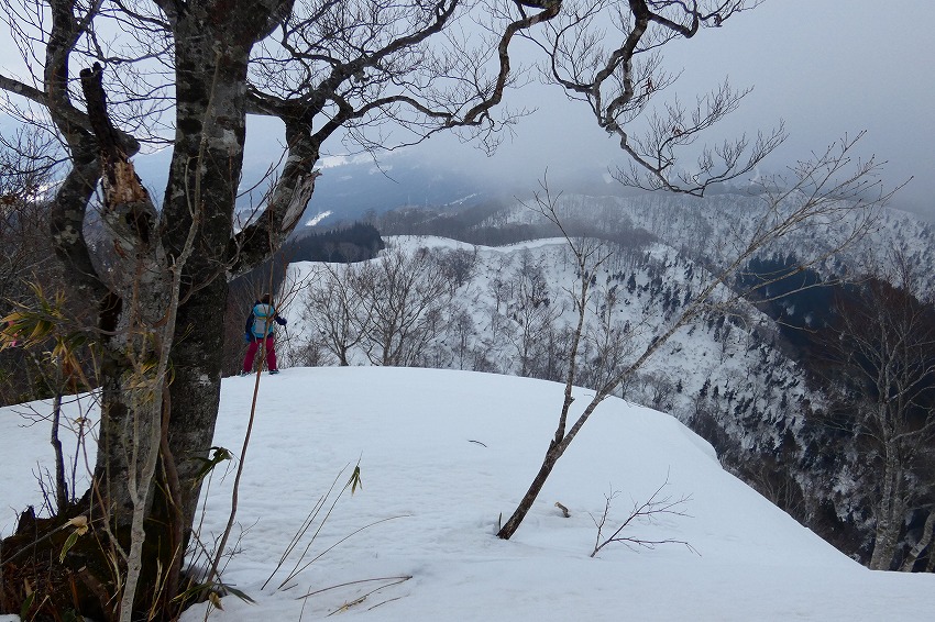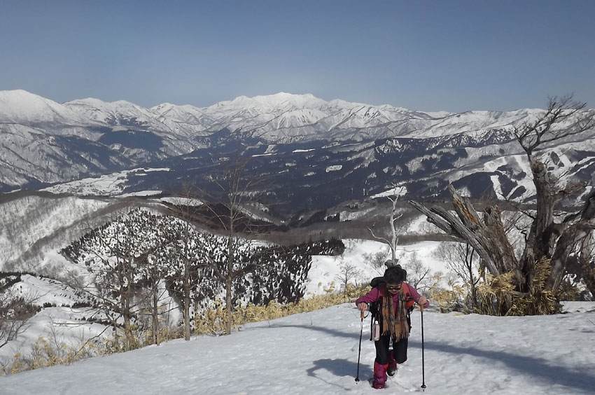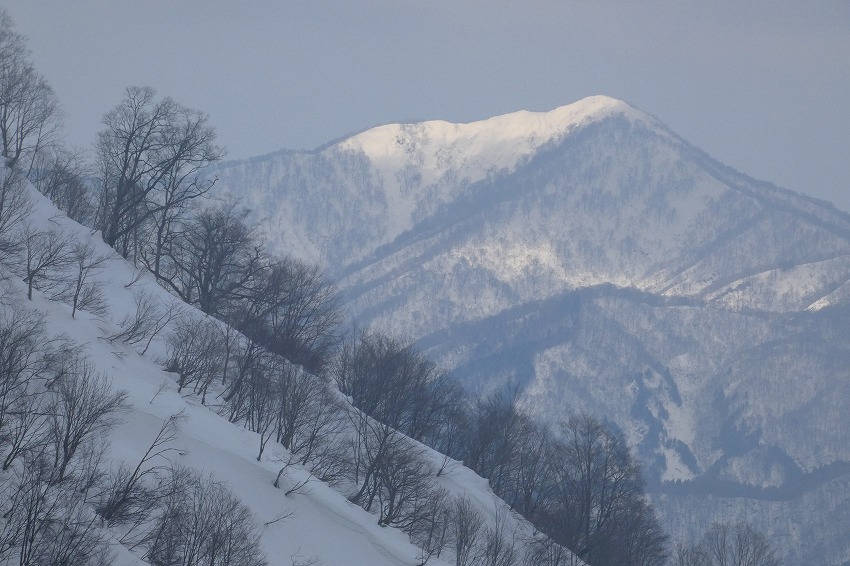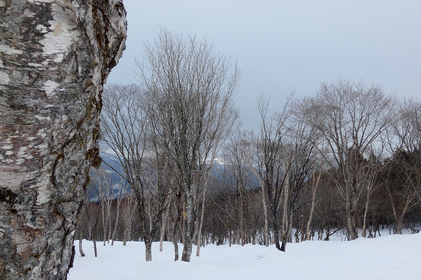 (ジオンさん記) 山を始めた19年前に、和たんと 毘沙門岳(2007.1.31)に行きましたが、 その日は ガスが出て 、山頂まで行きましたが、 全然展望なし。 途中で林道から、自衛隊の方がレスキューの訓練で来られて 、約10分ぐらい 登山道で待っていた記憶がありました。 最初はゲレンデの左手 から、すぐにスノーシューを履いて 登りますが 、 今日は暖かく 、そんなに雪も凍っていません。 ゲレンデの脇を、リフトの最終のところまで登ります。 ブナ林が綺麗です 。 そこから尾根に乗って、 毘沙門岳に。 今日は予報 あまり良くなく曇りで、昼から下り坂の予報です。 山頂近くはガスってますが、歩いた登山道も、展望も少し見られて嬉しいです。 行けるところまで行って帰っくる予定です。 途中 福井方面が少し晴れてきました 。 もう少し頑張って山頂まで行こうかと 、山頂 直下まで来ましたが、 結局 山頂の方がまたガスってきて、無理せずに 戻ります。 ゲレンデ トップから上の登りは、結構 アップダウンがあって、今日はわかんの方が良かったかなと、思いました。 ゲレンデまで戻って、ここからの降りは、日本一長い 1.5kmの ソリすべりができる ゲレンデ。 子供達の歓声が聞こえます。今度はそりを持ってきて、 ゲレンデを滑りたいです。 ゲレンデの横をずーっと歩きましたが 、これが緩やかな下り坂で、 トレースなしで、ゲレンデから上はわかんが良かったのですが 、 この降りは、なだらかで気持ちが良く 、スノーシューで気持ちよく歩けて良かったです 。✌ 前日は快晴。晴れたら、こんな景色が